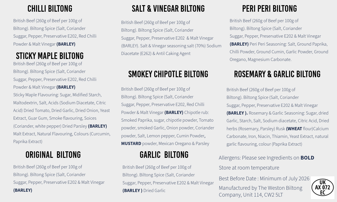 - 5 generous portions of our signature beef biltong varieties